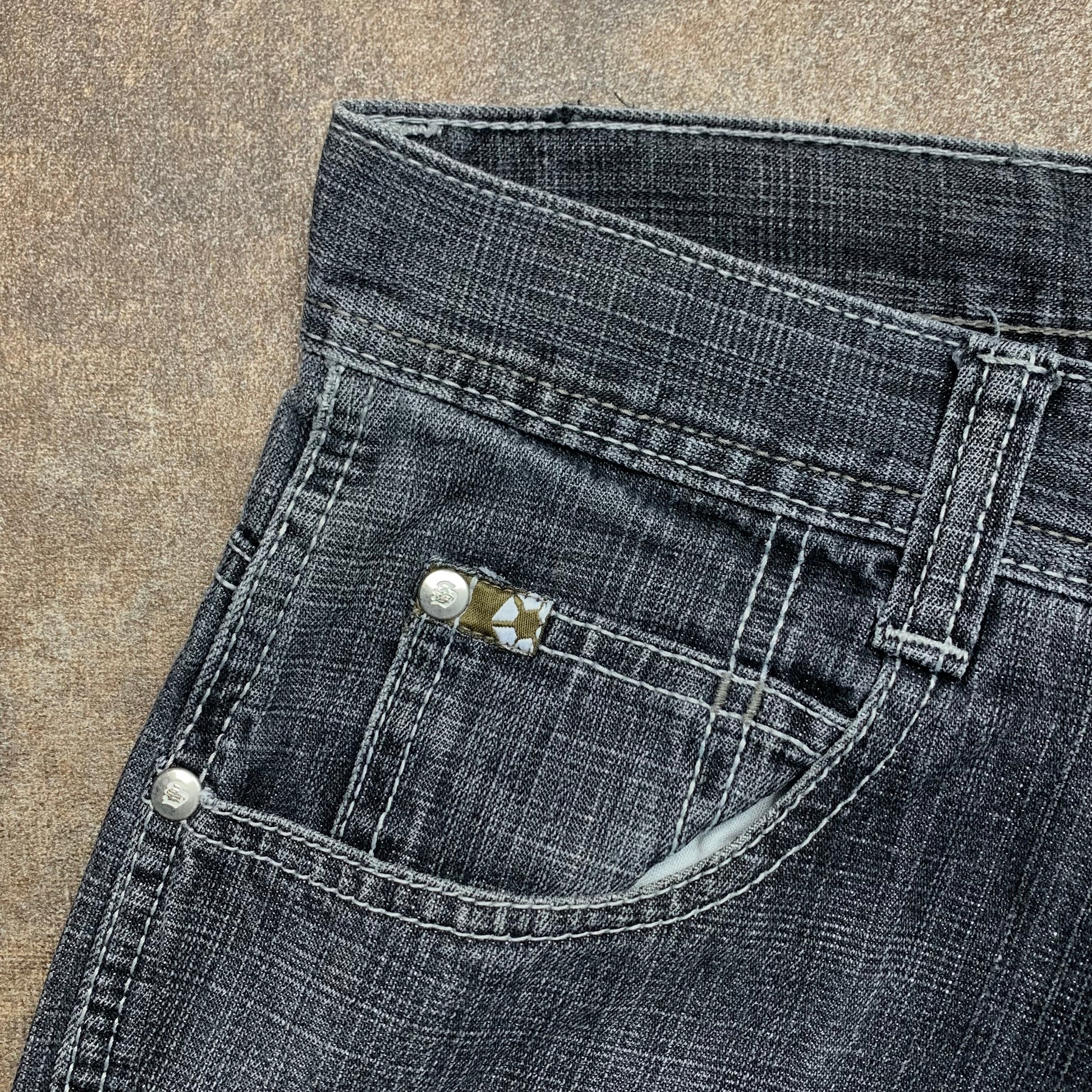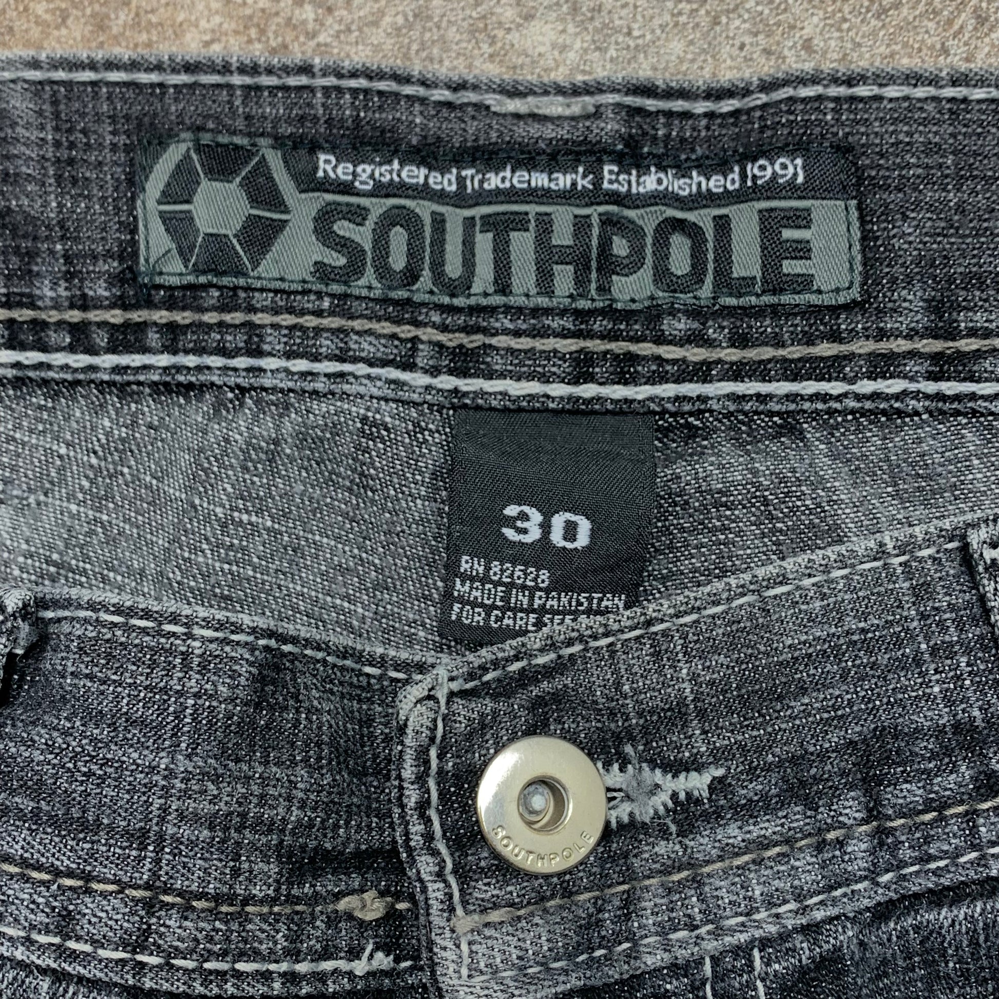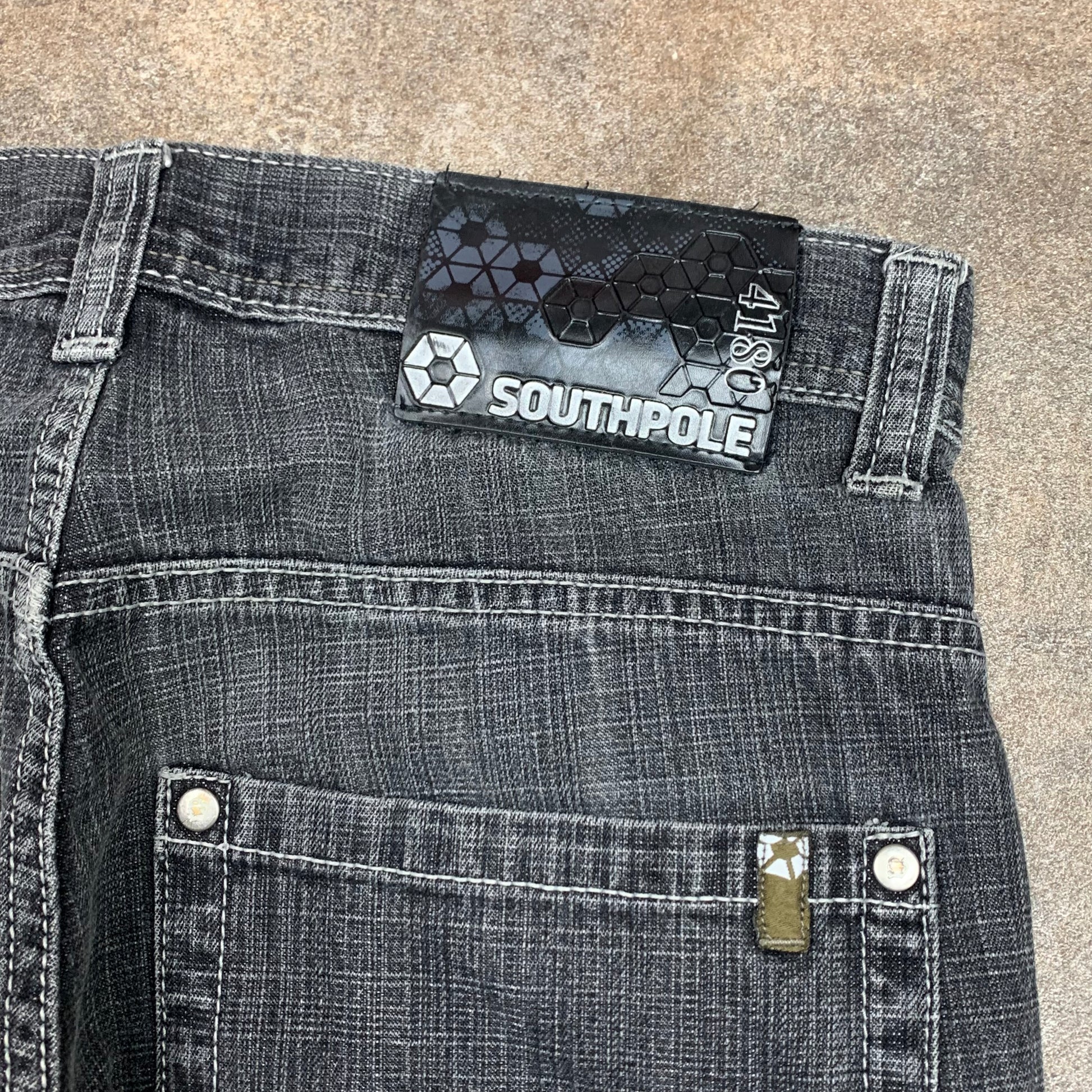 Short vintage Southpole jeans with branded tabs on the back & front right pockets / jacron, coloured washed black / grey, baggy fit & in excellent second hand condition, taken up.