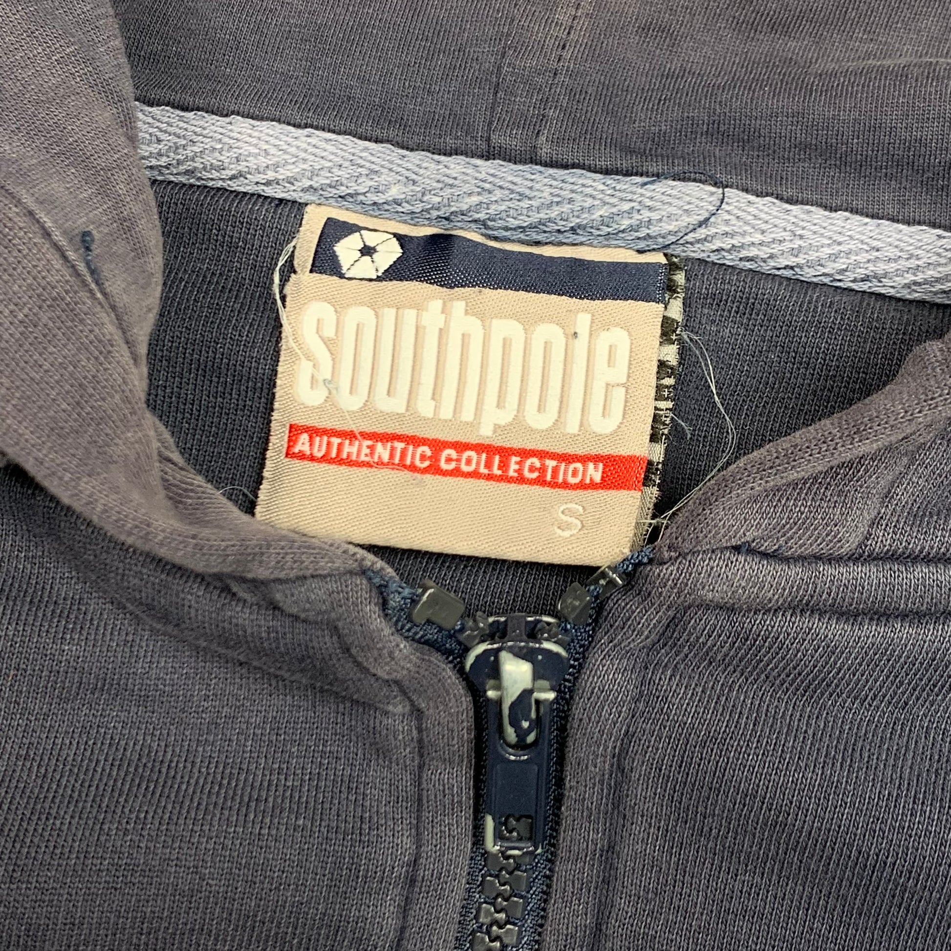 Vintage Southpole hoodie with a large felt graphic across the front zip, coloured navy all over & in very good second hand condition with a repaired hole on the sleeve & scuffs by the cuffs.