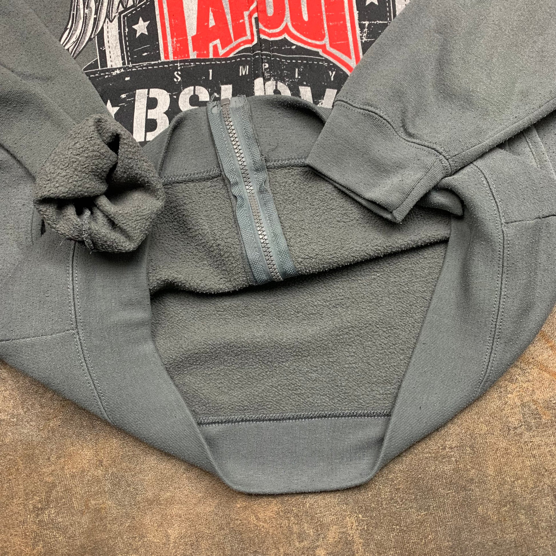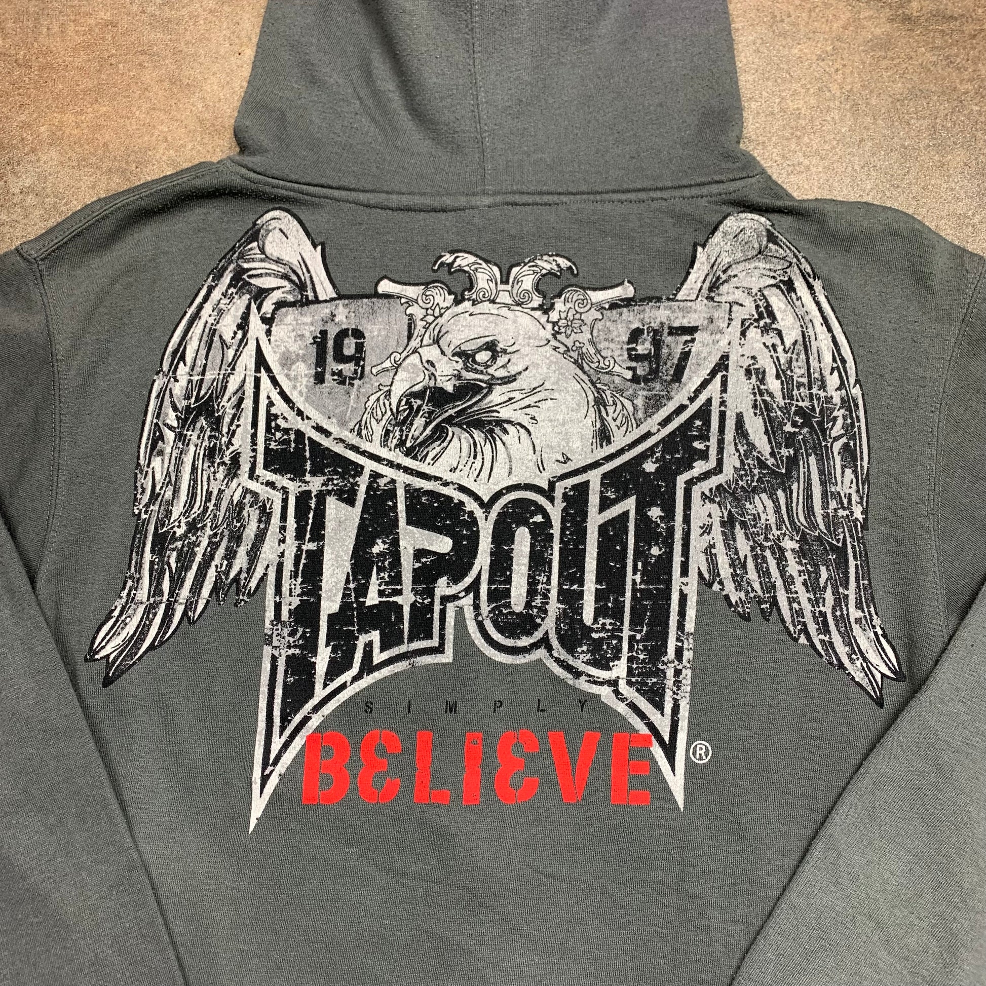 Rare Tapout hoodie with grunge style printed graphics front and back, coloured grey all over, branded zip / tab on the hood and in excellent second hand condition with minimal wear.