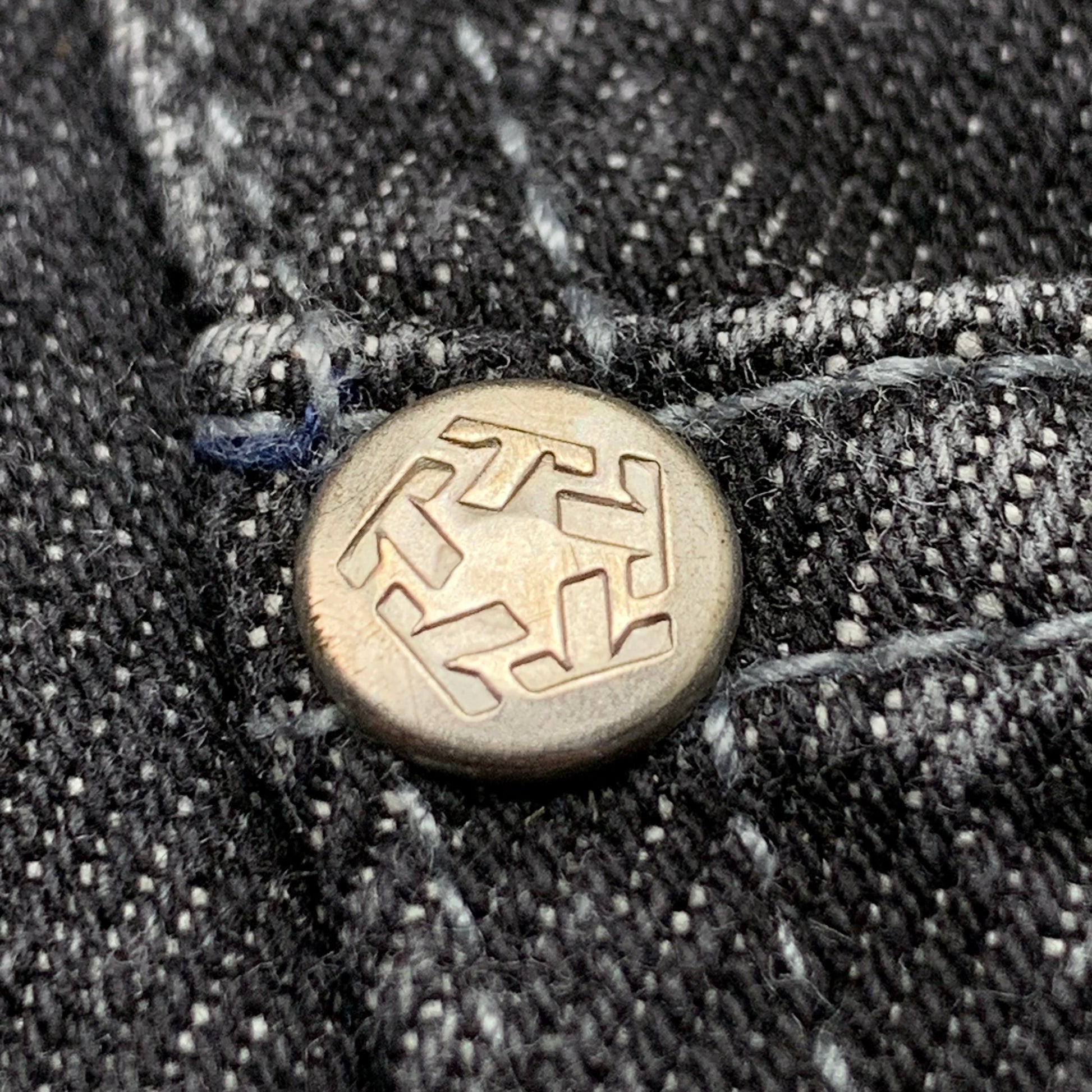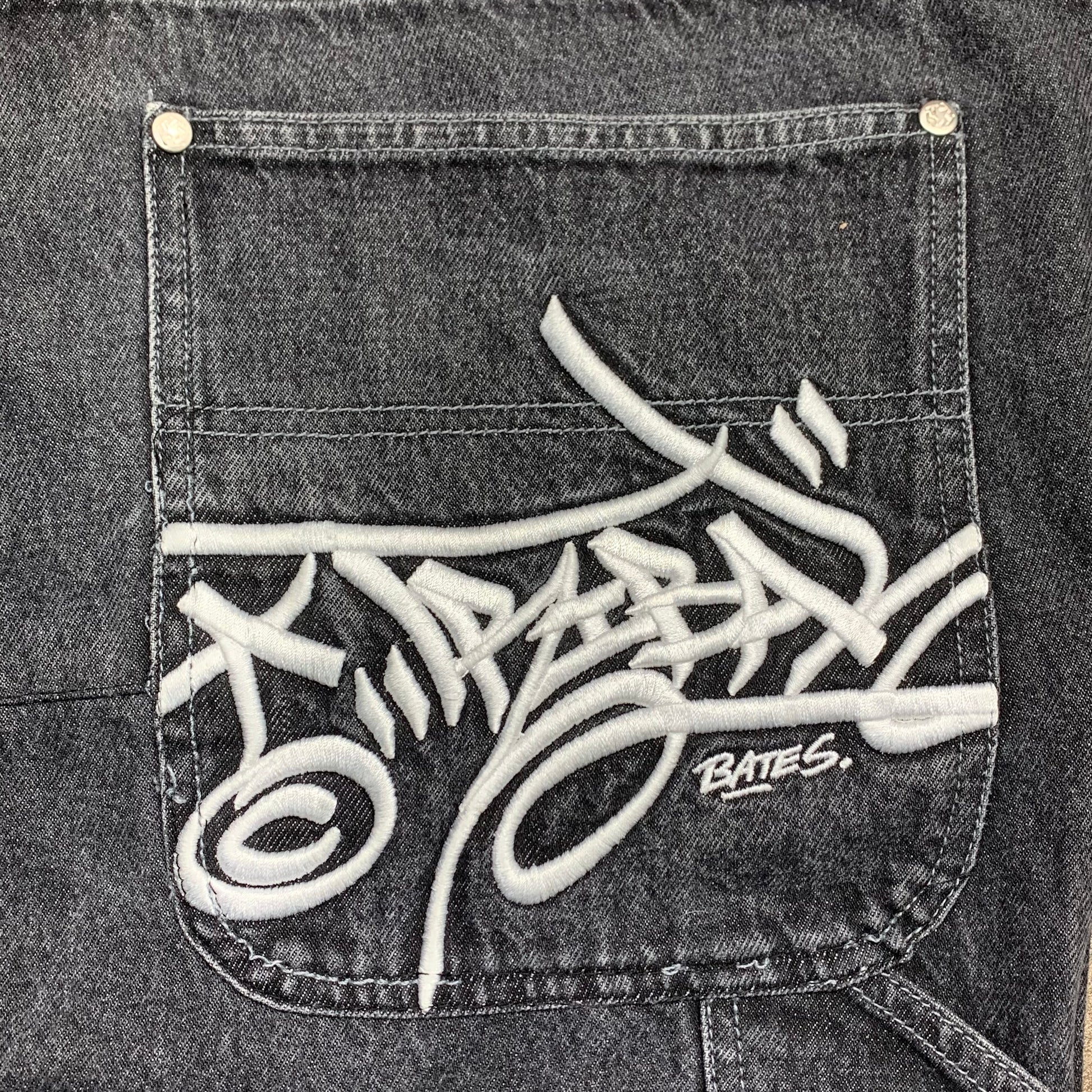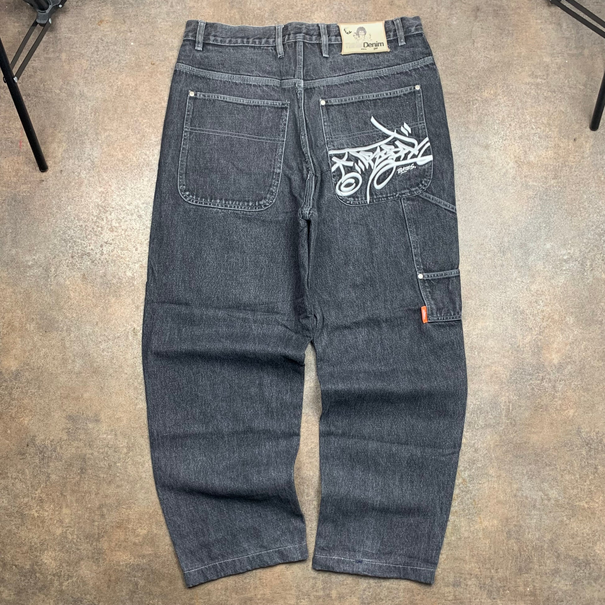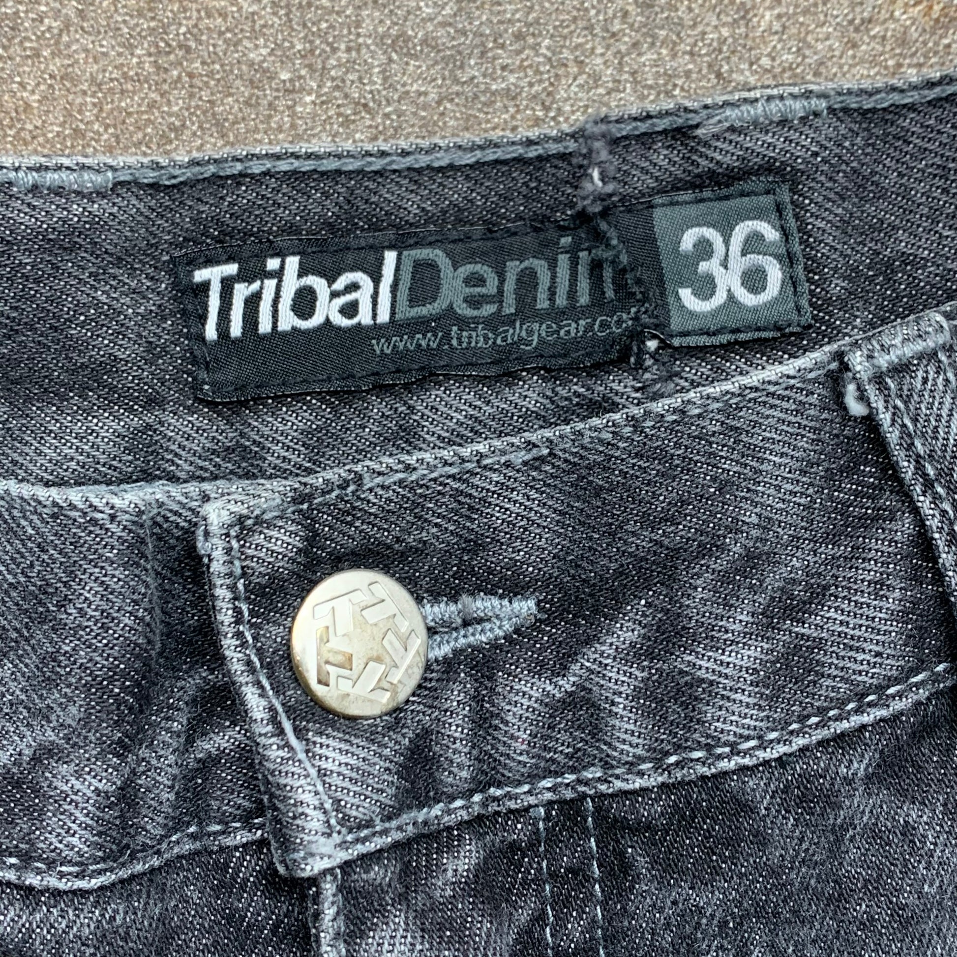 Rare Tribal jeans with an embroidered logo on the back right pocket, branded tab on the carpenter pockets, graphic belt patch, coloured black / dark grey all over & in great second hand condition with repair & minimal wear as shown.
