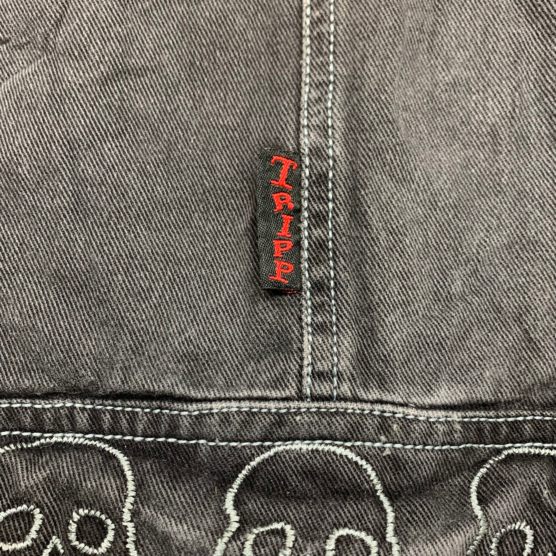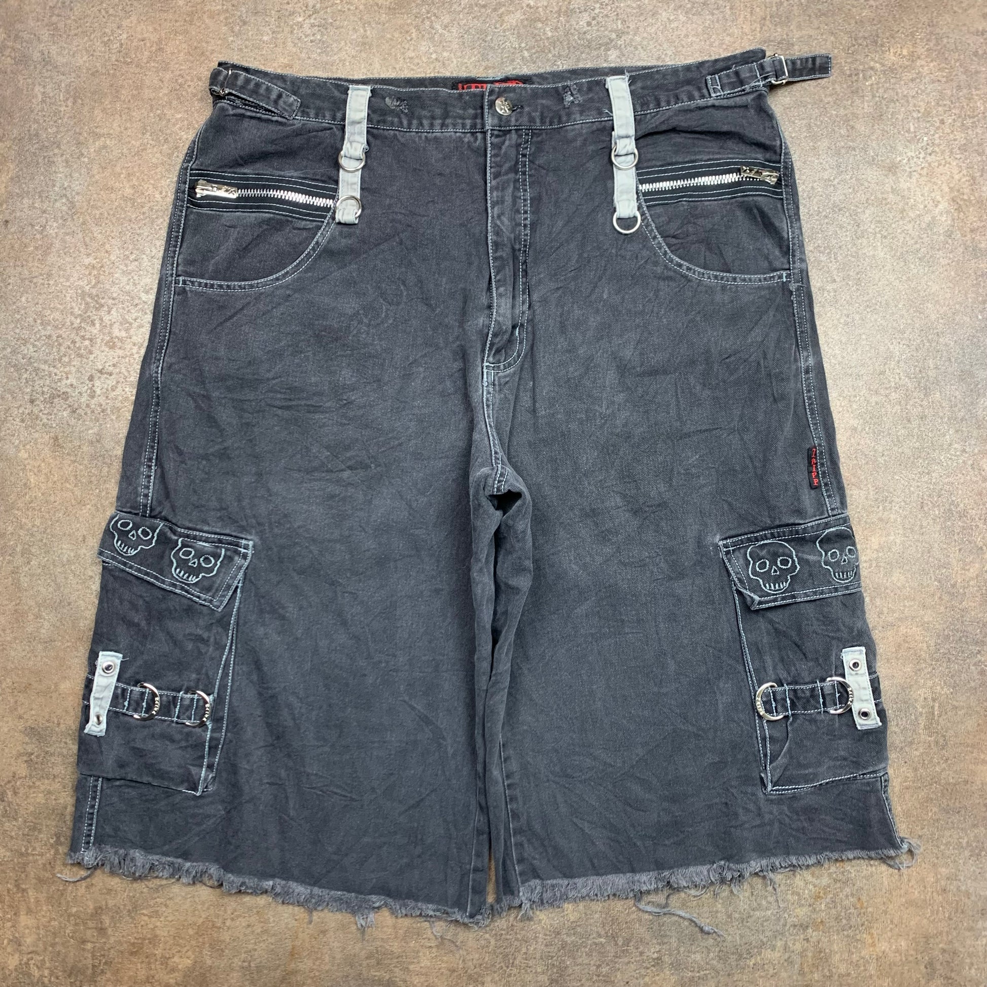 Rare Tripp jorts with branded hardware, embroidered skulls on the cargo pockets, a branded tab on the left leg, white denim accents, coloured black all over & wear to the back of the left leg as shown.