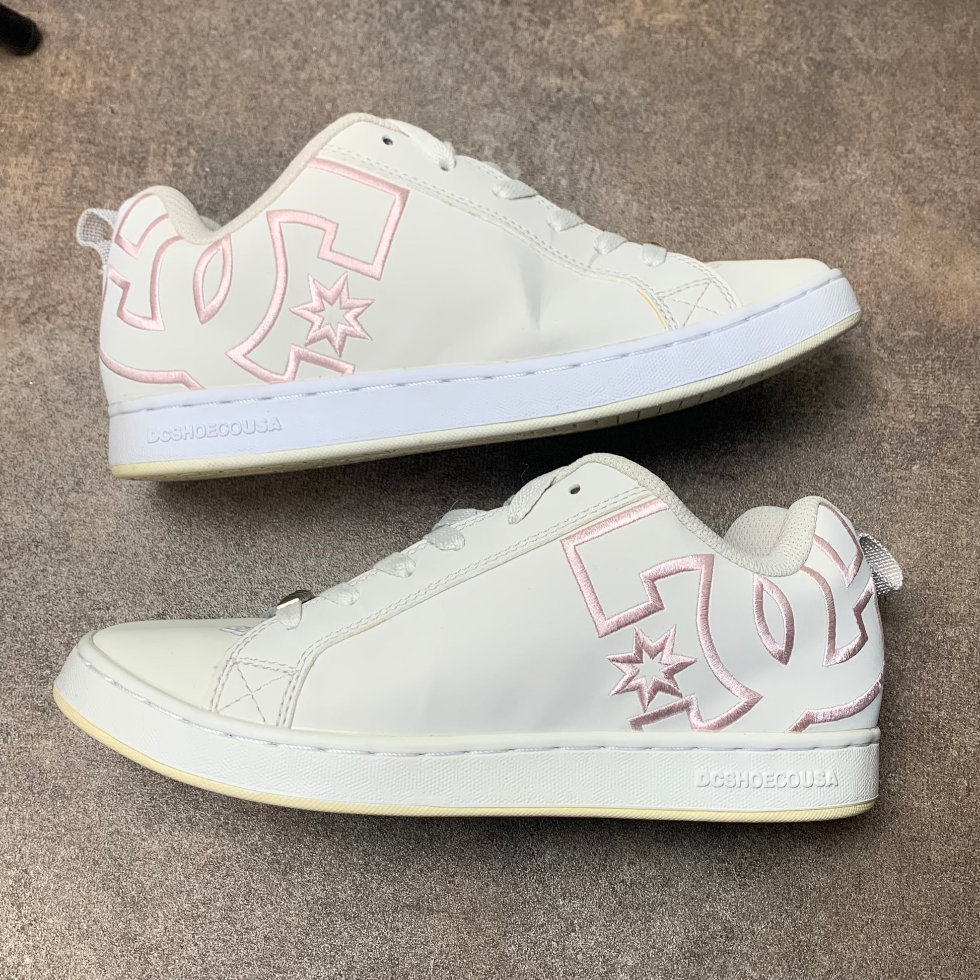 Big star logos on the outsides with pink embroidered borders, coloured white all over, pyramid studs on the bottom laces & in great second hand condition with some creasing as shown.