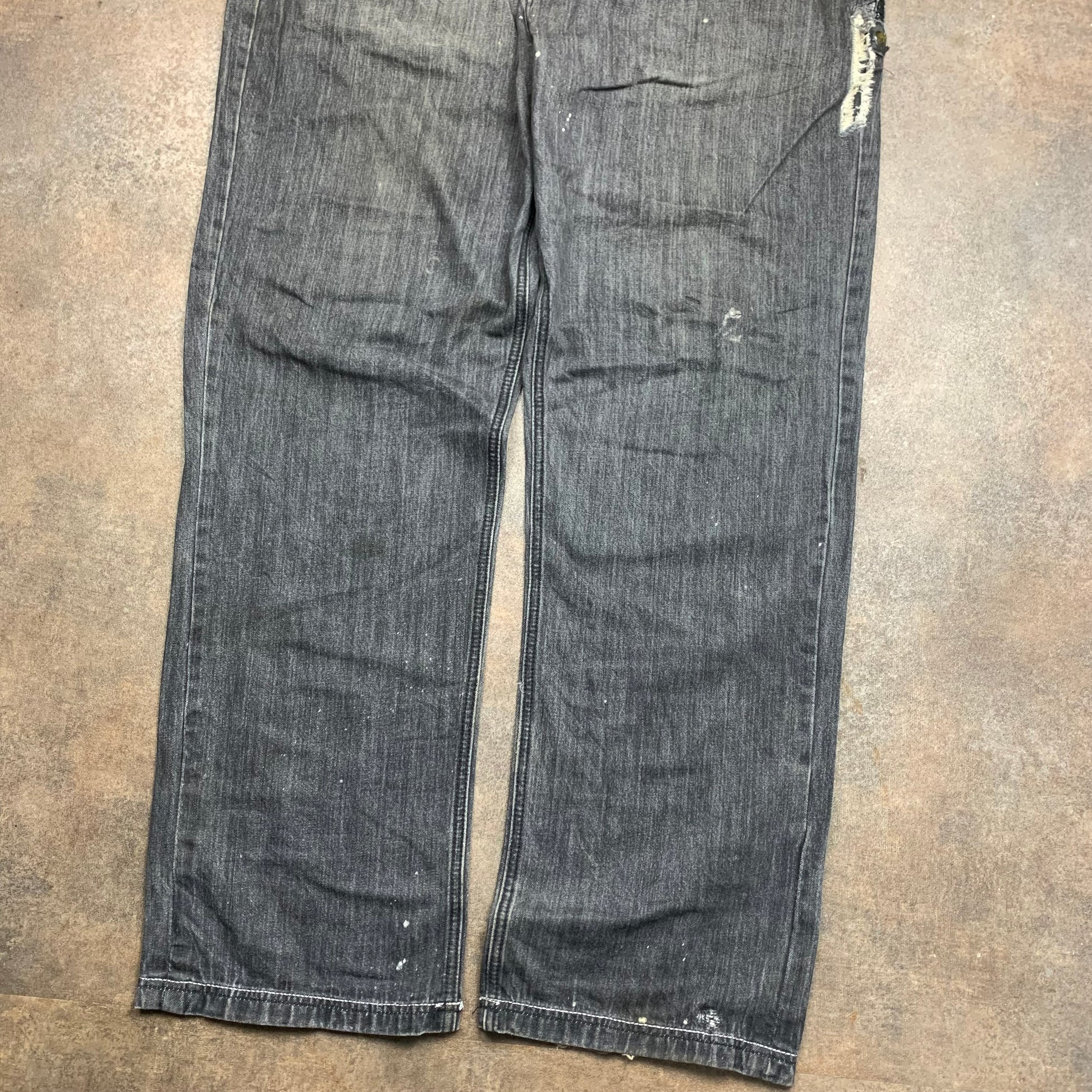 Rare Crown Holder jeans with metal hardware on the back right pockets / jacron, coloured black all over, in a baggy fit and in good second hand condition with wear / repair as shown.