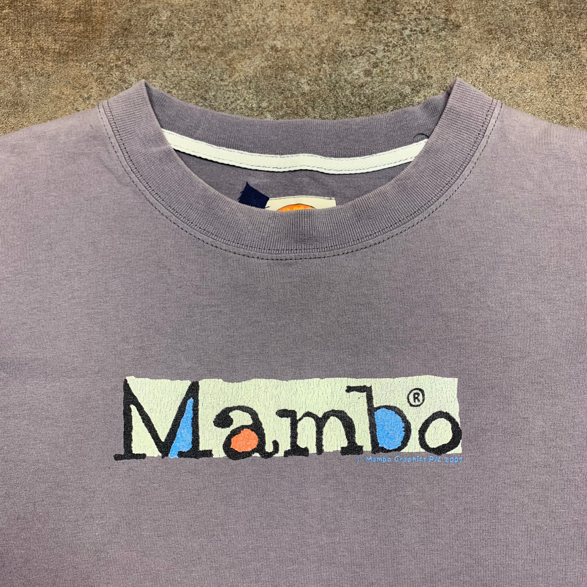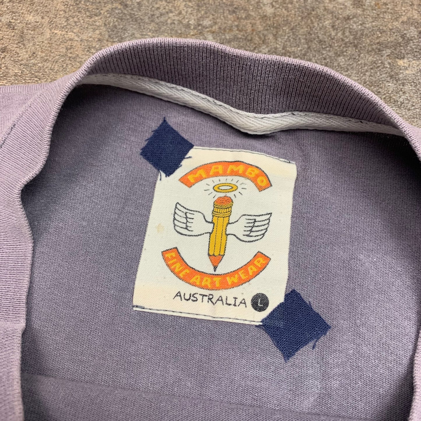 Mambo Cheapskate tee with prints back & front, coloured faded purple-grey all over & in great second hand condition with 2 repairs to holes at the top of the back as shown.